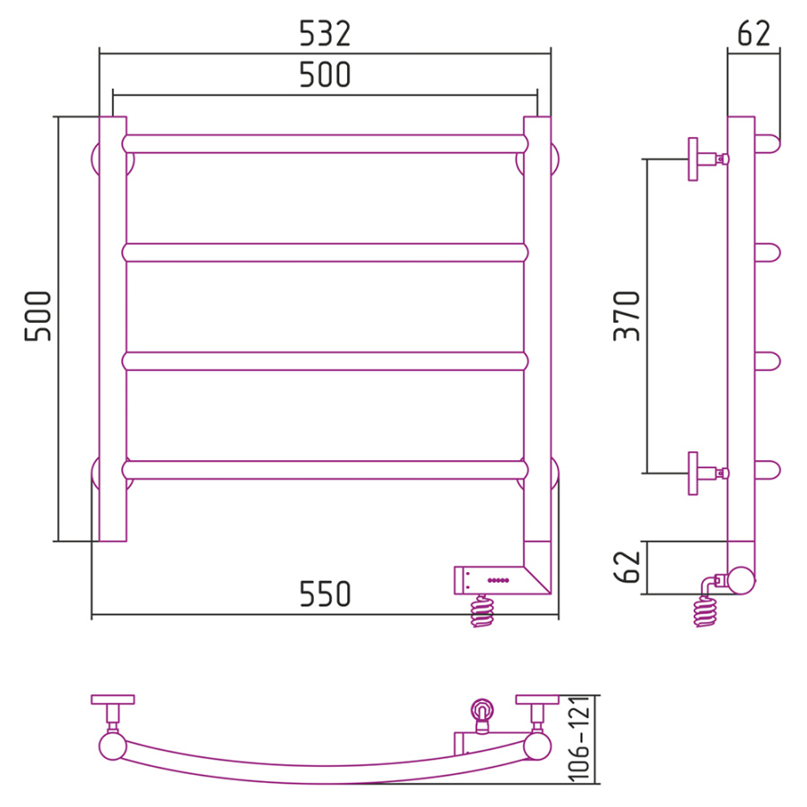 Полотенцесушитель, блок управления с кабелем, телескопические кронштейны, шестигранный ключ, дюбели и саморезы. Приобретается отдельно: модуль скрытого подключения для мэм d 28 мм