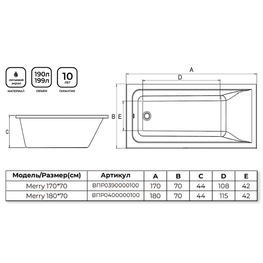 Акриловая ванна ALBA SPA Merry 170x70 белая, без ножек
