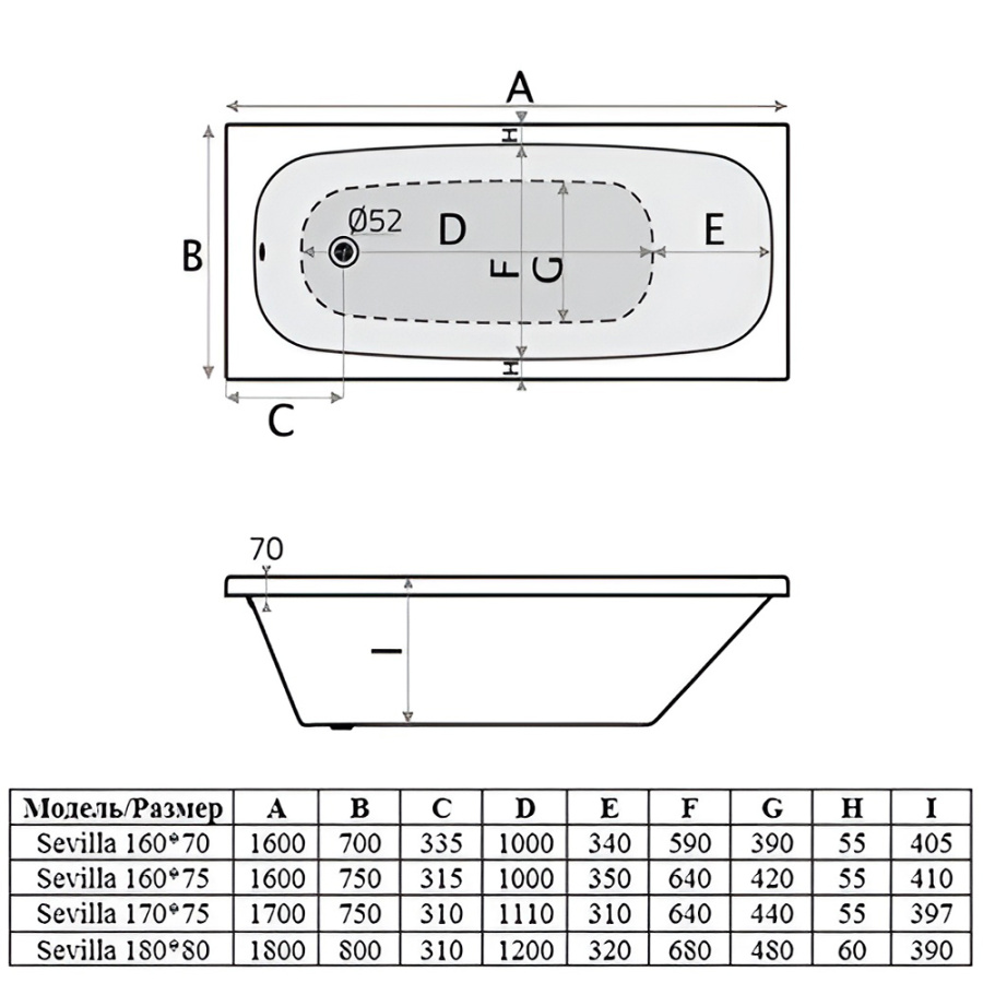 Акриловая ванна ALBA SPA Sevilla 160x75 белая, без ножек