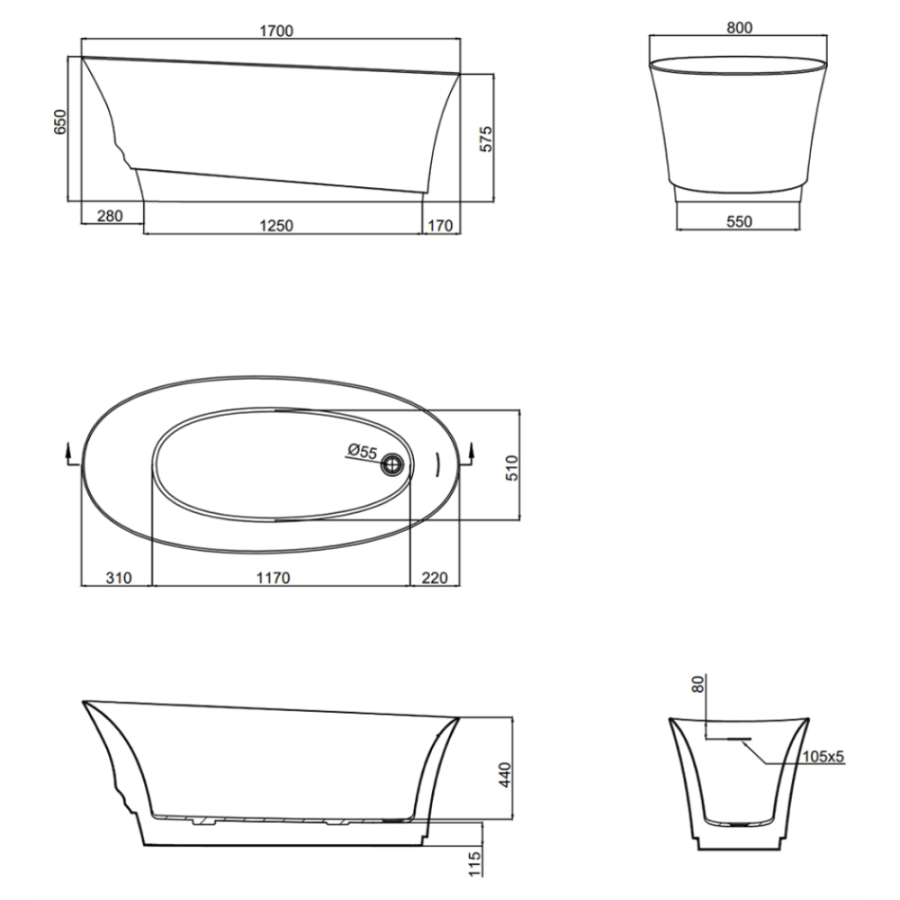 Акриловая ванна AVS Афродита 170x80 белая с донным клапаном