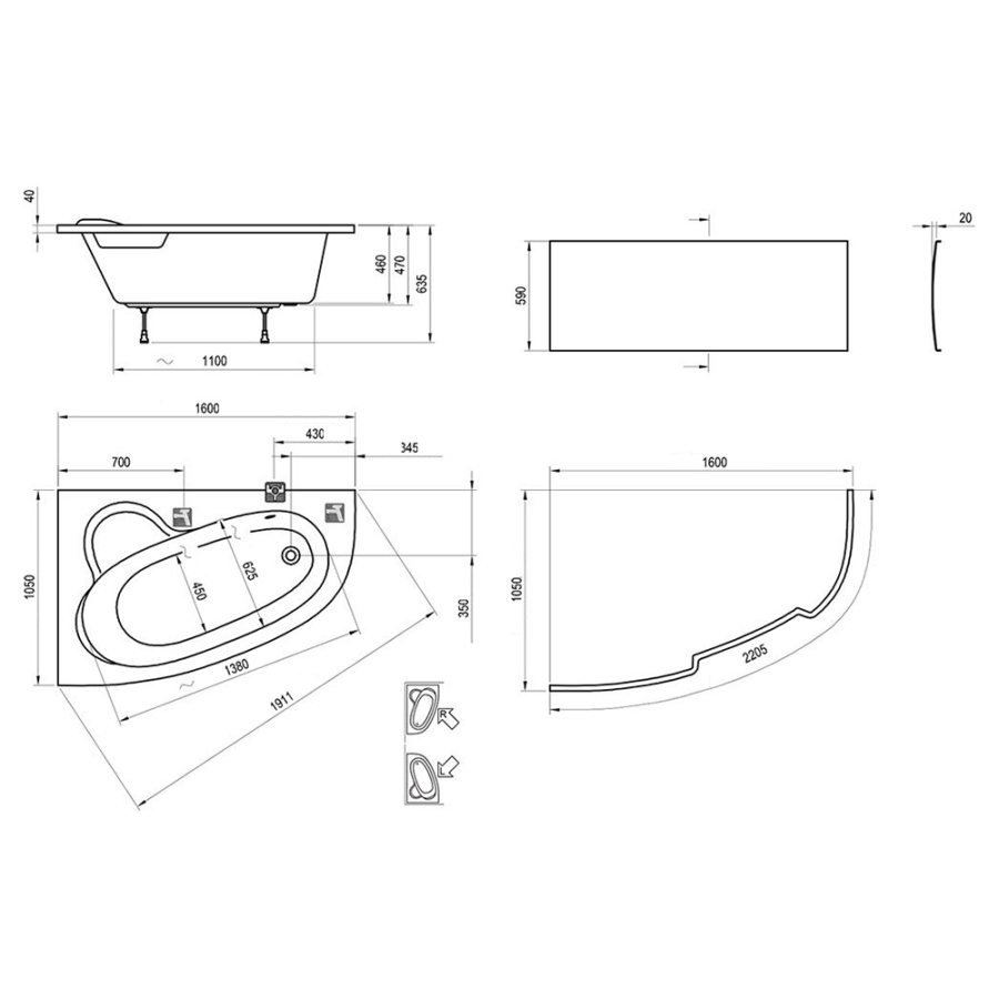 Акриловая ванна Ravak Asymmetric 160x105 R белая, с ножками и экраном