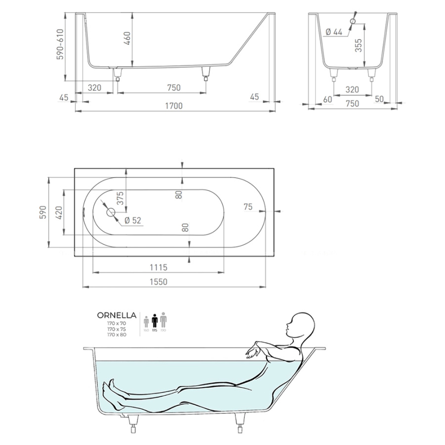 Ванна из искусственного камня Salini Ornella S-Sense 170x75 белая матовая с ножками