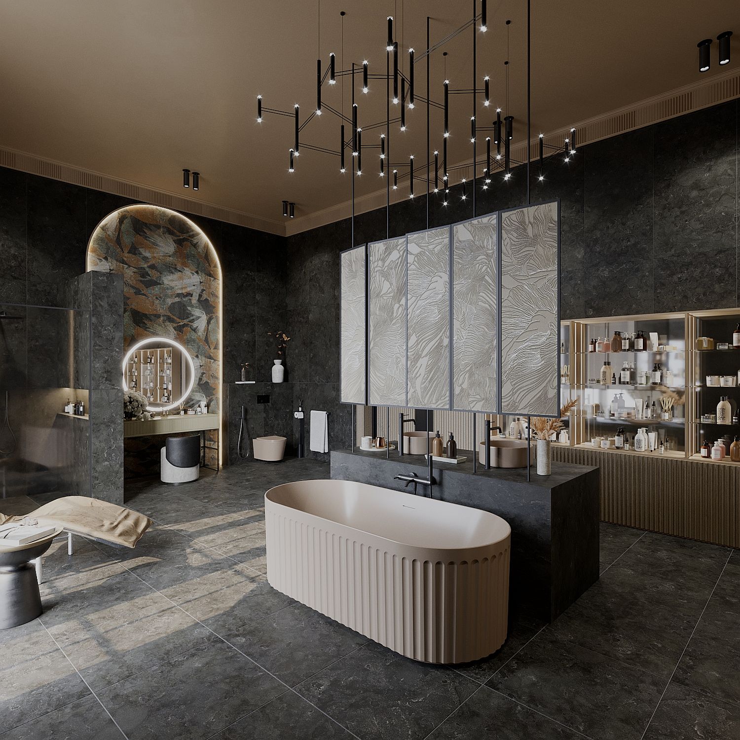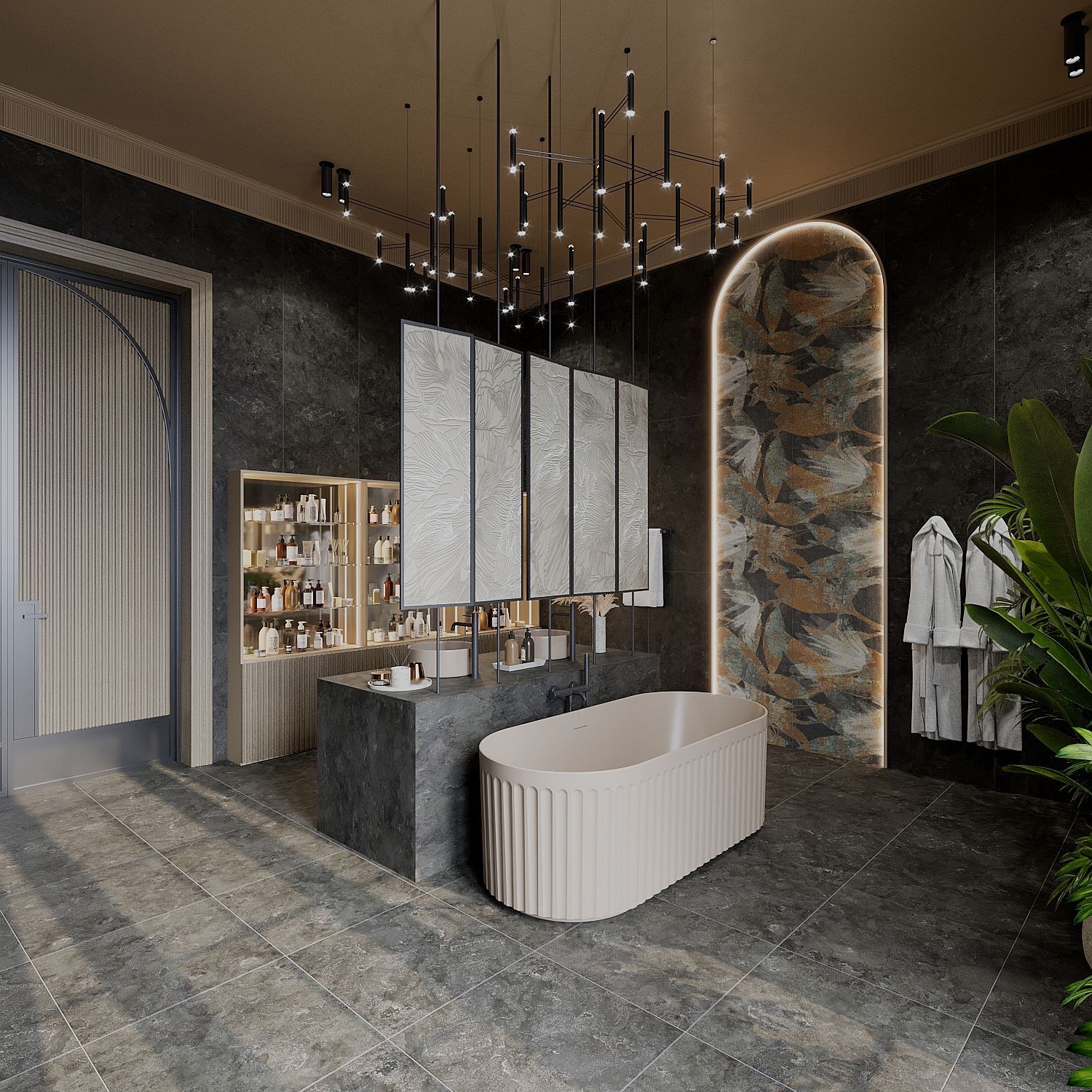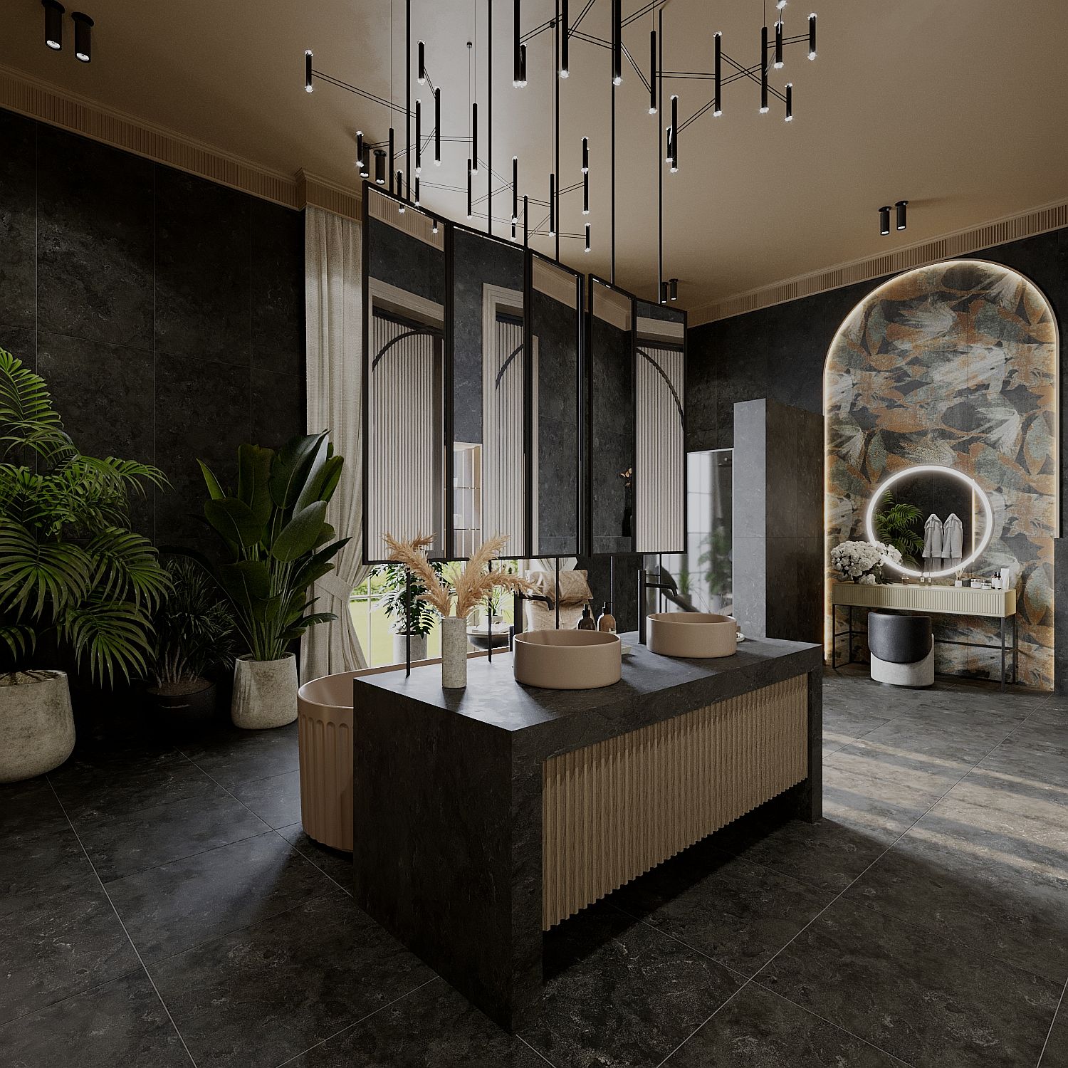 Перед Вами мастер-ванная комната при главной спальне в частном доме в городе Сочи . В своём проекте я хотел подчеркнуть масштабы помещения, выделить окно, так как окна всегда украшение любого помещения, не говоря о ванных комнатах. Сохранить простор, при этом разместить всё необходимое для своих Главных Героев. В этом как я считаю способствует уникальная не стандартная планировка.