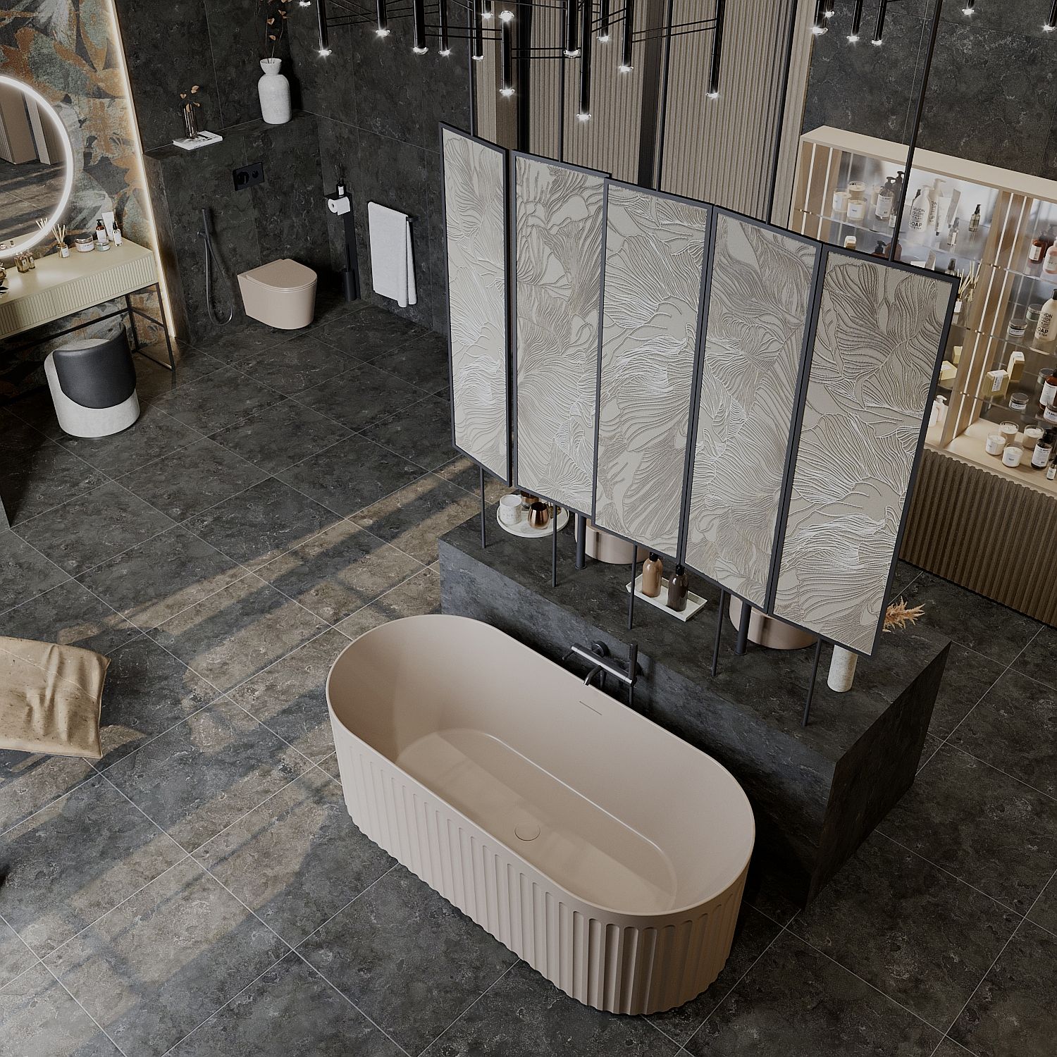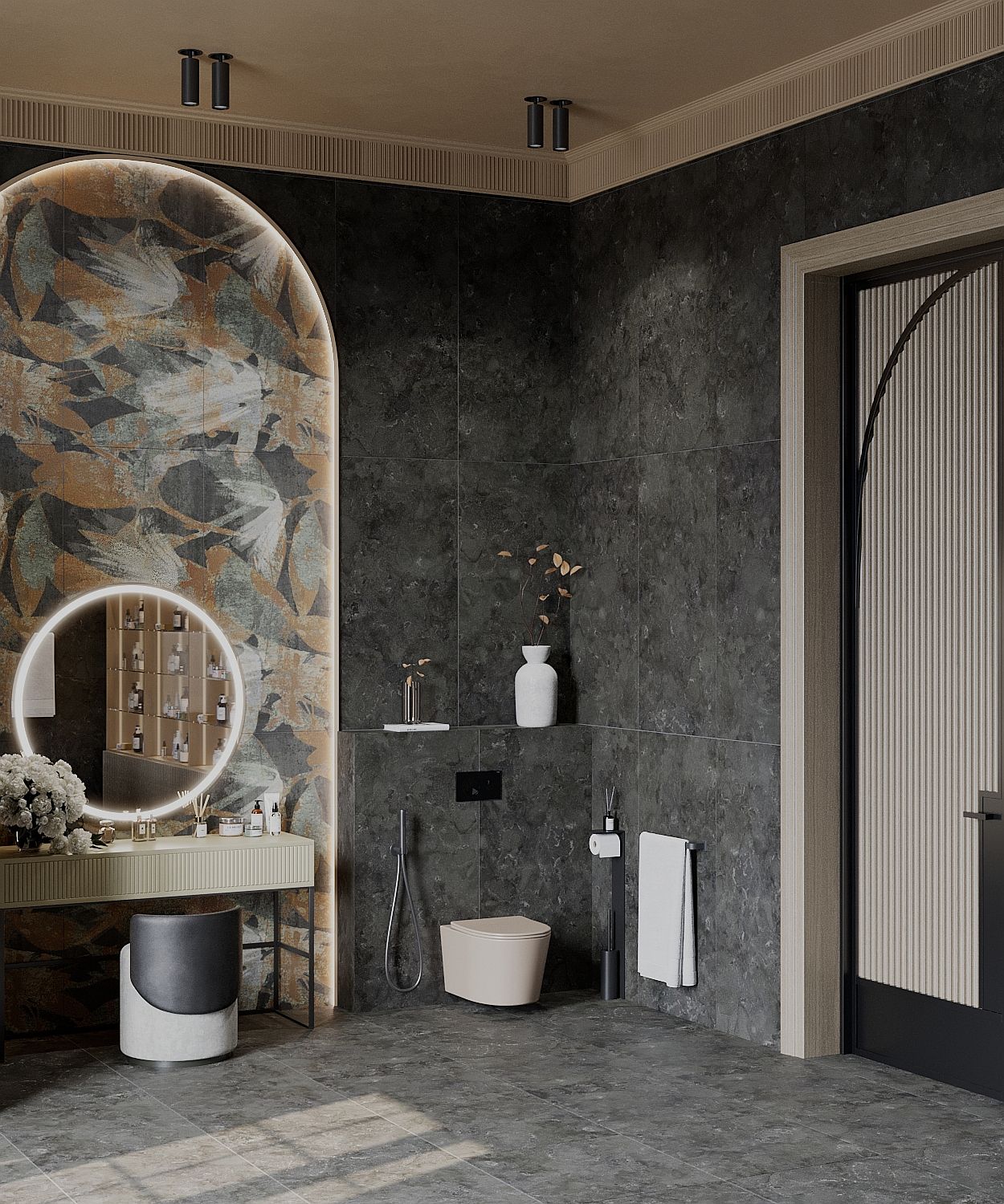 В плане оформления мною был выбран театральный почти чёрный керамогранит, где я разбавляю его яркими вставками, а также вношу дополнительные цвета, которые можно сказать и делают эту комнату тёплой, уникальной и на мой взгляд сохраняя её сдержанной, что немаловажно. Конечно это было бы не возможно без уникальных цветных предметов сантехники