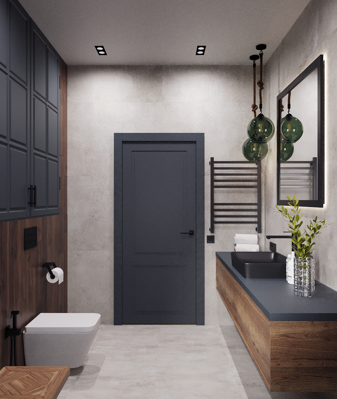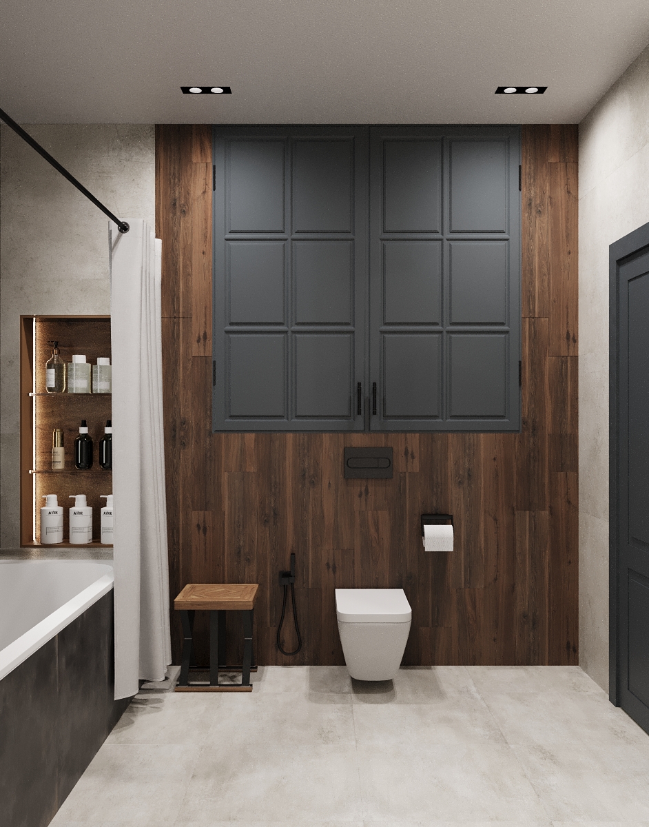 Функциональная небольшая ванная комната в частном доме, оформленный в стиле хайте для молодой семьи. Основной задачей было создать практичный и эстетичный интерьер, но без значительных затрат. В качестве ключевого акцента выбрана раковина от Аквамира черного цвета, этот цвет продолжен (дополнен) мною в смесителе AVS, кнопкой смыва и полотенцесушителем, душевой стойки. Этот интерьер очень брутальный, но при этом уютный благодаря включению природных материалов, таких как двери из массива над подвесным унитазом, За этими дверями прекрасно поместились все принадлежности хозяев дома. Он также сочетает в себе продуманную эргономику и утонченную эстетику.
