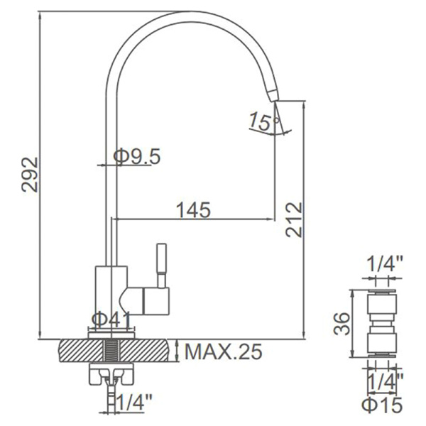 Этот кран устанавливается параллельно с обычным краном для водопроводной воды, и используется исключительно для подачи очищенной воды из фильтра. Он часто имеет особенный дизайн, чтобы отличаться от других кранов на кухне.