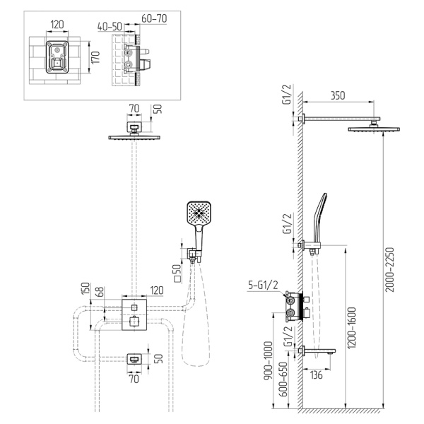 Встраиваемые души и элементы доступны в различных дизайнах — от ультрасовременных до классических. Размеры компонентов также можно подобрать исходя из площади ванной комнаты.